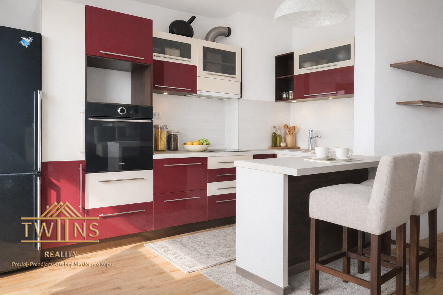 Dispozícia bytu: vstupná predsieň so samostatným šatníkom, kuchyňa prepojená s obývacou časťou/izbou, samostatné WC a kúpeľňa s vaňou. V izbe bude doplnená aj masívna drevená posteľ, ktorá zatiaľ nie je na fotografiách.
