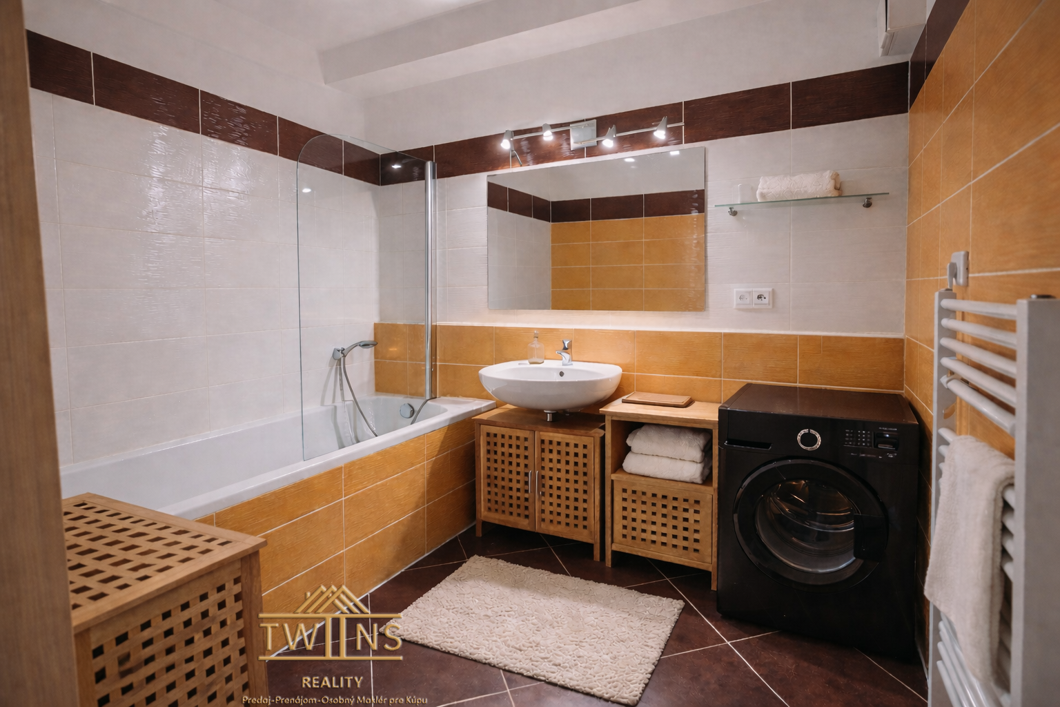 Byt je kompletne zariadený a vybavený spotrebičmi: sporák, chladnička, mikrovlnná rúra, rýchlovarná kanvica a práčka.